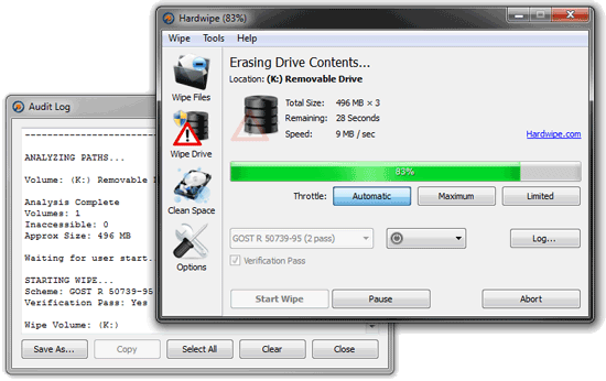 With this files shredder software, you can permanently erase, or to “hard wipe”, data on disk and portable storage media (i.e. USB drives and memory sticks) in order to prevent personal or sensitive business information from ever being recovered. There are three data wiping options on their left interface: Wipe Files (delete selected files and folders), Wipe Drive (wipe complete folders or drives) and Clean Space (clean the free space of drives) buttons. Speed Control Button namely Automatic, Full Speed and Restricted can be found on the right side while Start Wipe and Reset buttons are available at the bottom while, overwriting scheme can be selected from the drop down menu.